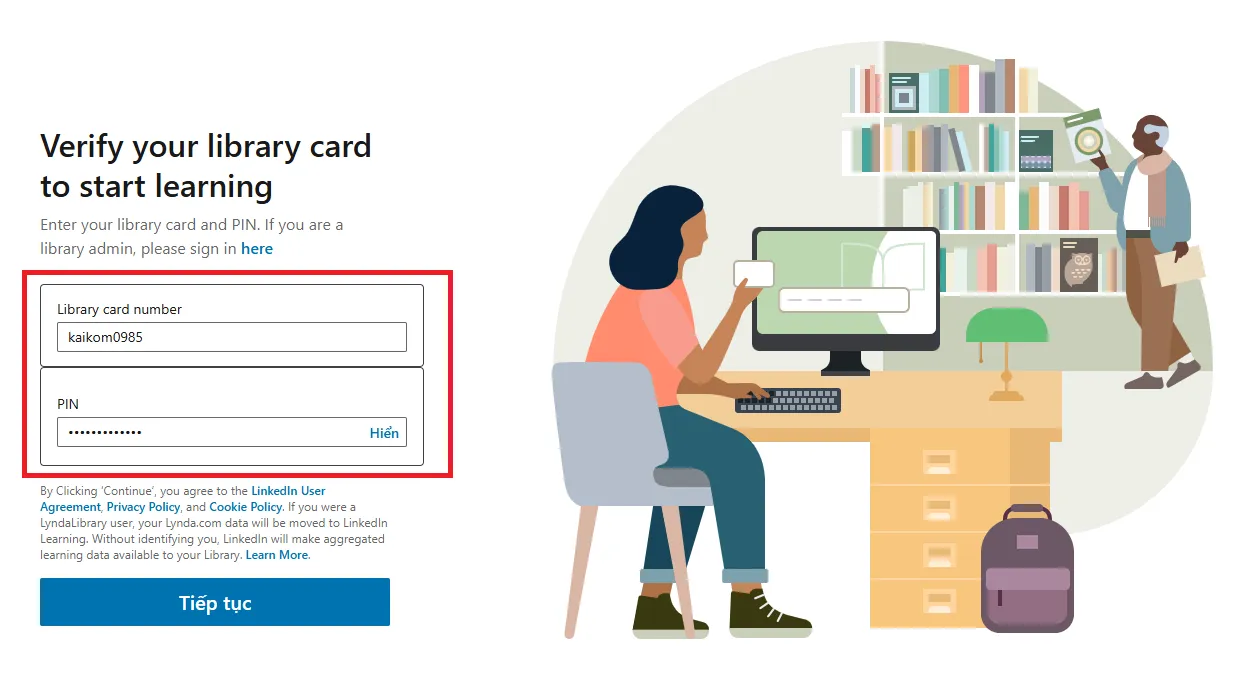 Bước 2: Điền thông tin đăng nhập bao gồm số thẻ thư viện và mã PIN, sau khi điền xong chọn Tiếp tục.