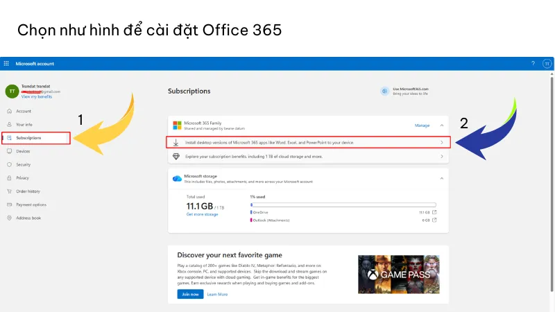 - Truy cập https://microsoft.com/, đăng nhập bằng tài khoản Microsoft 365 của bạn. Sau đó chọn vào Avartar -> My Microsoft Account (Tài khoản Microsoft của tôi) sau đó làm các bước như hình để tải xuống bộ cài đặt
