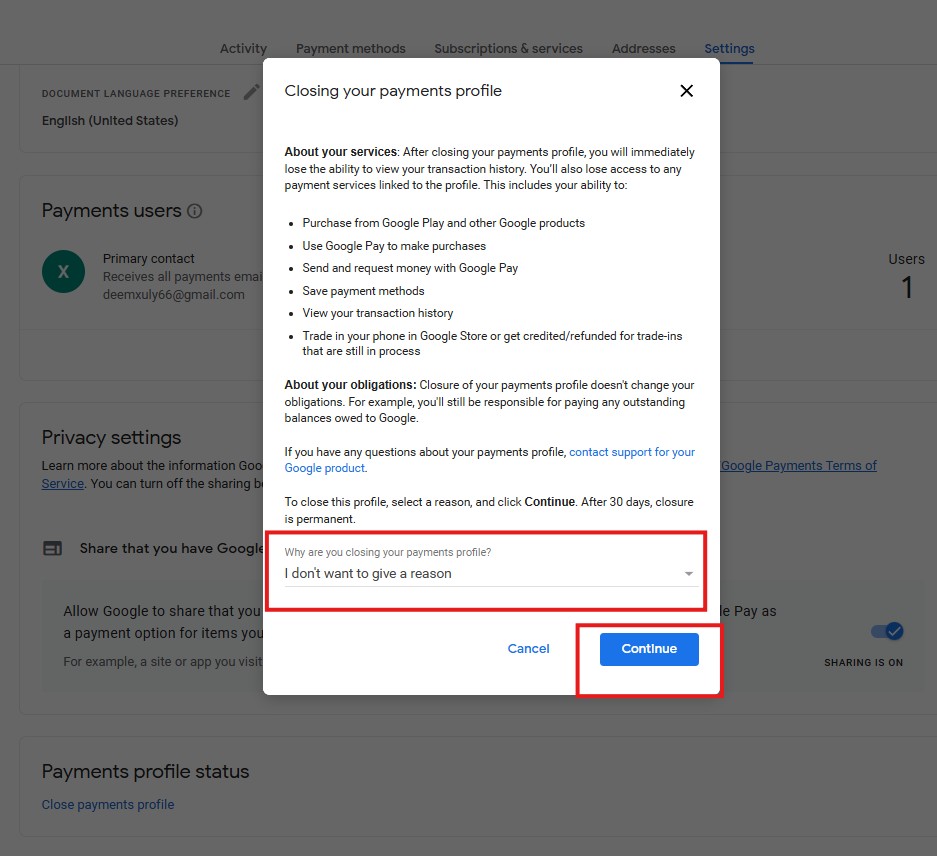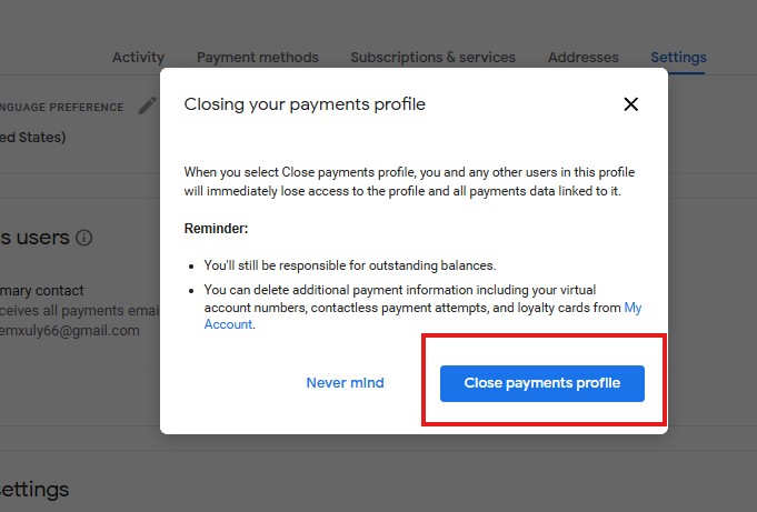 Bước 2: Kéo xuống tận cùng Chọn Close payments profile ( Đóng phương thức thanh toán) màu xanh