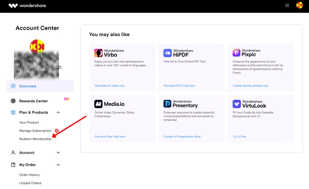 Bước 2: Ở mục “Plan & Products” bên trái sổ ra, chọn vào Redeem Membership